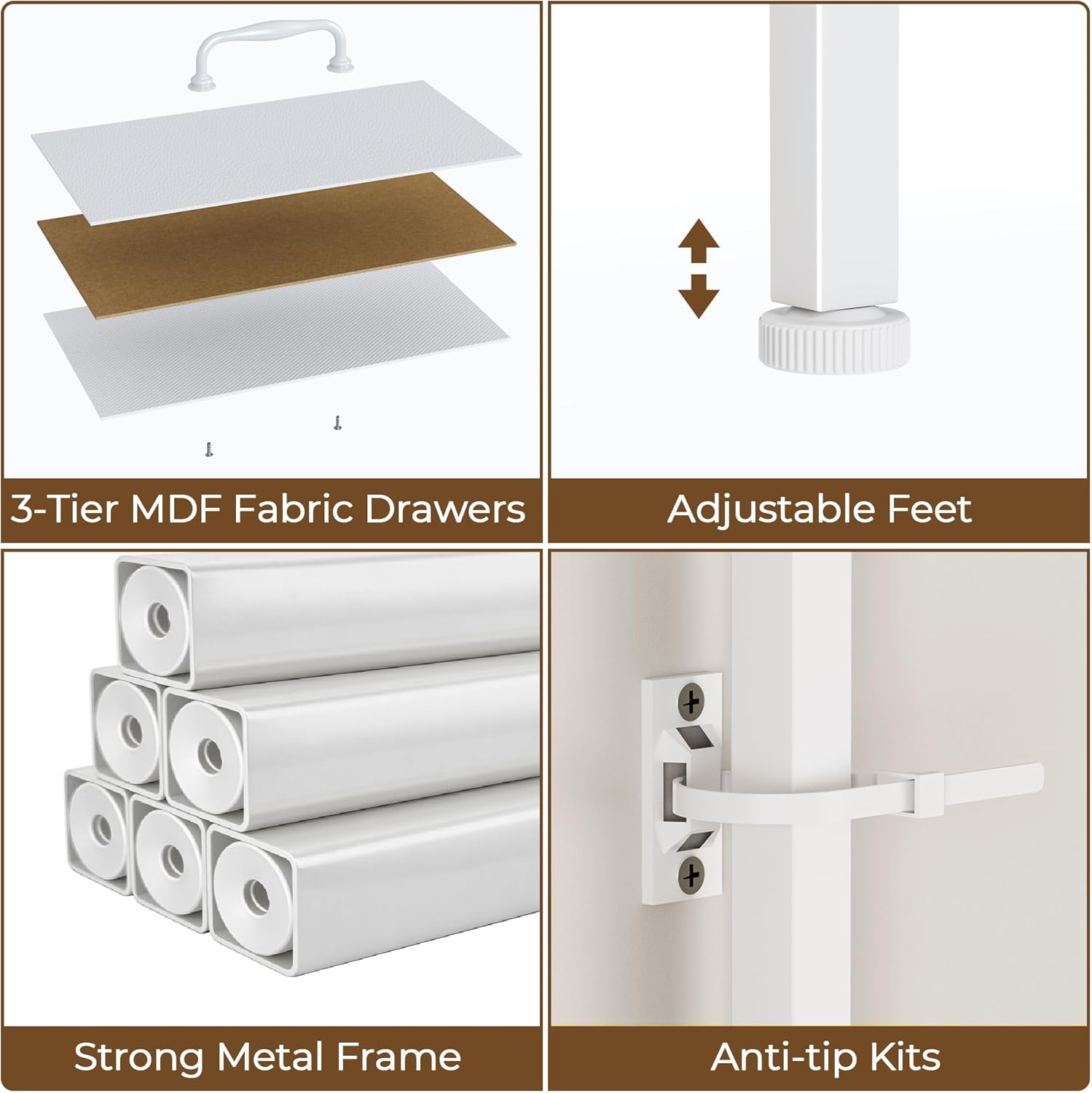 - 【Sturdy& Safe& Stable Structure】The Bedroom dresser is made of high-quality wood countertop and a durable metal frame. Adjustable feet ensures stability on uneven floors or carpets, while included anti-tip kits provide added safety against tipping.