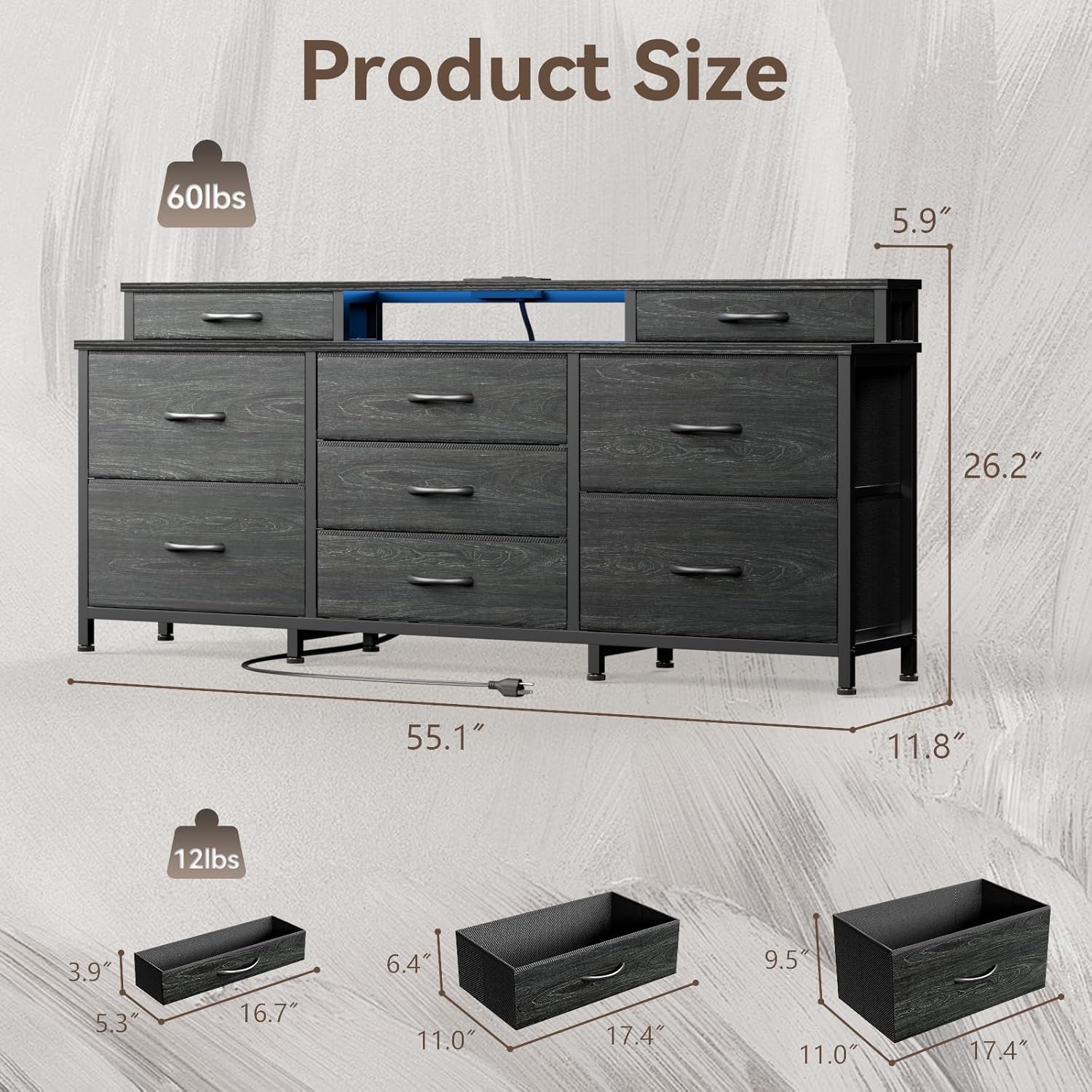 Furnulem Dresser, Black Dresser for Bedroom with 9 Storage Organizer Drawers and Open Shelf, 55" Entertainment Center with LED Lights and Charging Station, Chest of Drawers for Living Room Bedroom
