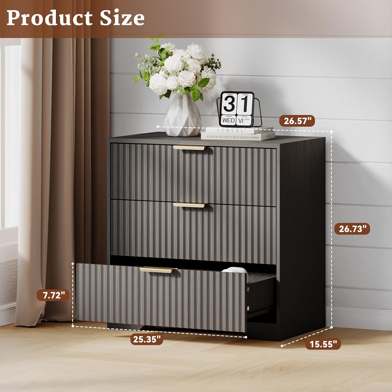 Furnulem Fluted 3-Drawer Night Stand, Black Modern Bedroom Side Table with Elegant Design – Compact Bedside Table for Small & Large Bedrooms